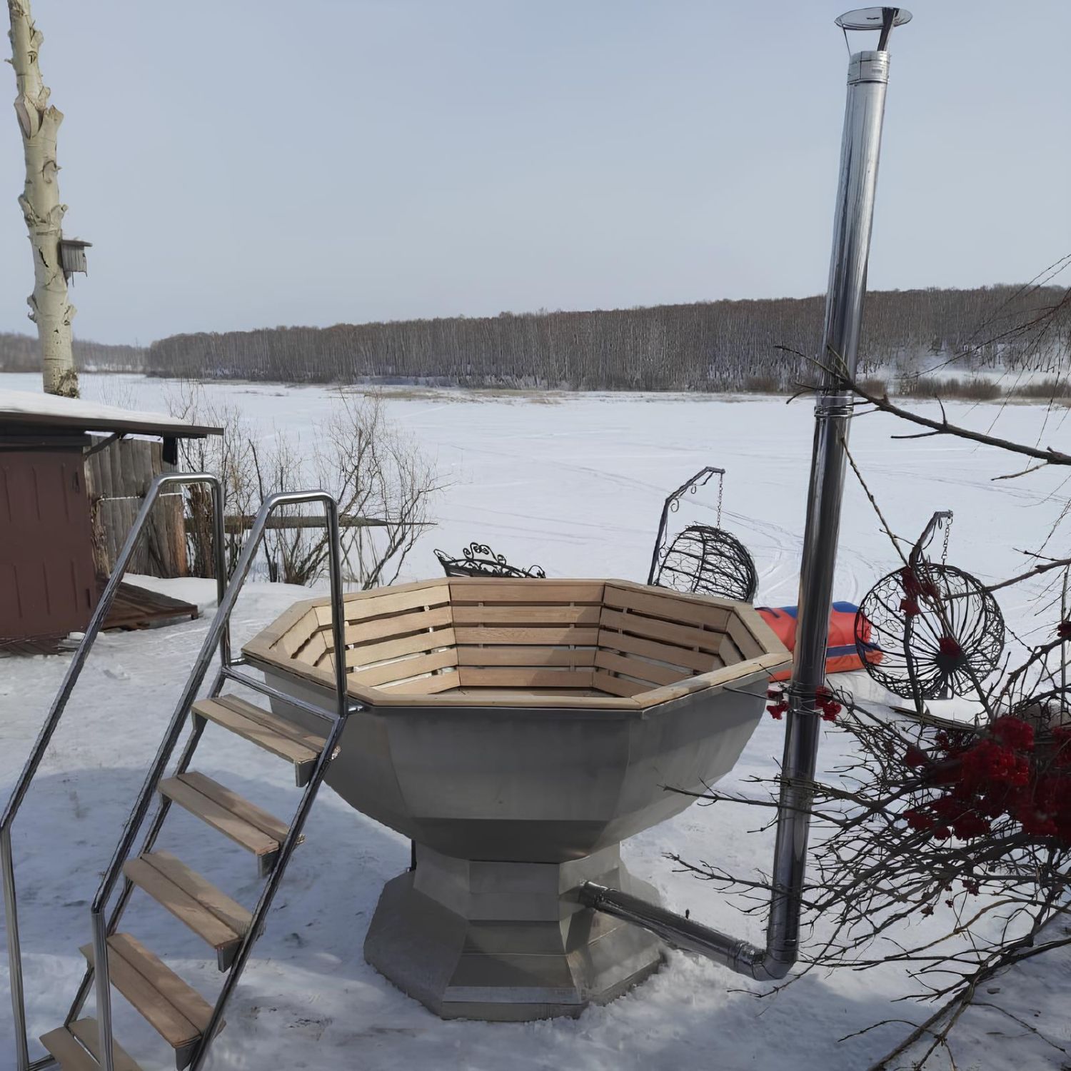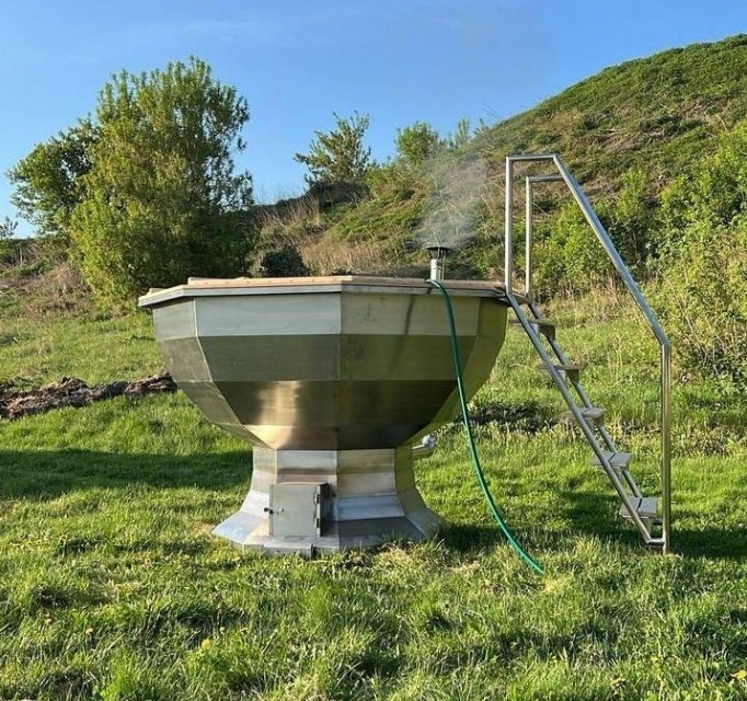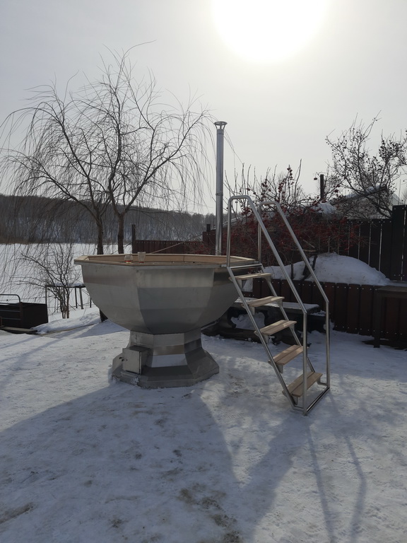 Для Банного чана доступны два варианта исполнения: из нержавеющей стали толщиной 3 мм или из стали марки AISI 304 толщиной 2 мм. Печь может быть изготовлена из нержавеющей стали толщиной 4 мм либо 3 мм. В конструкции реализован принцип кругового нагрева воды через печь, благодаря чему прогревается не только дно, но и весь объем воды, циркулирующий через нагревательный контур.