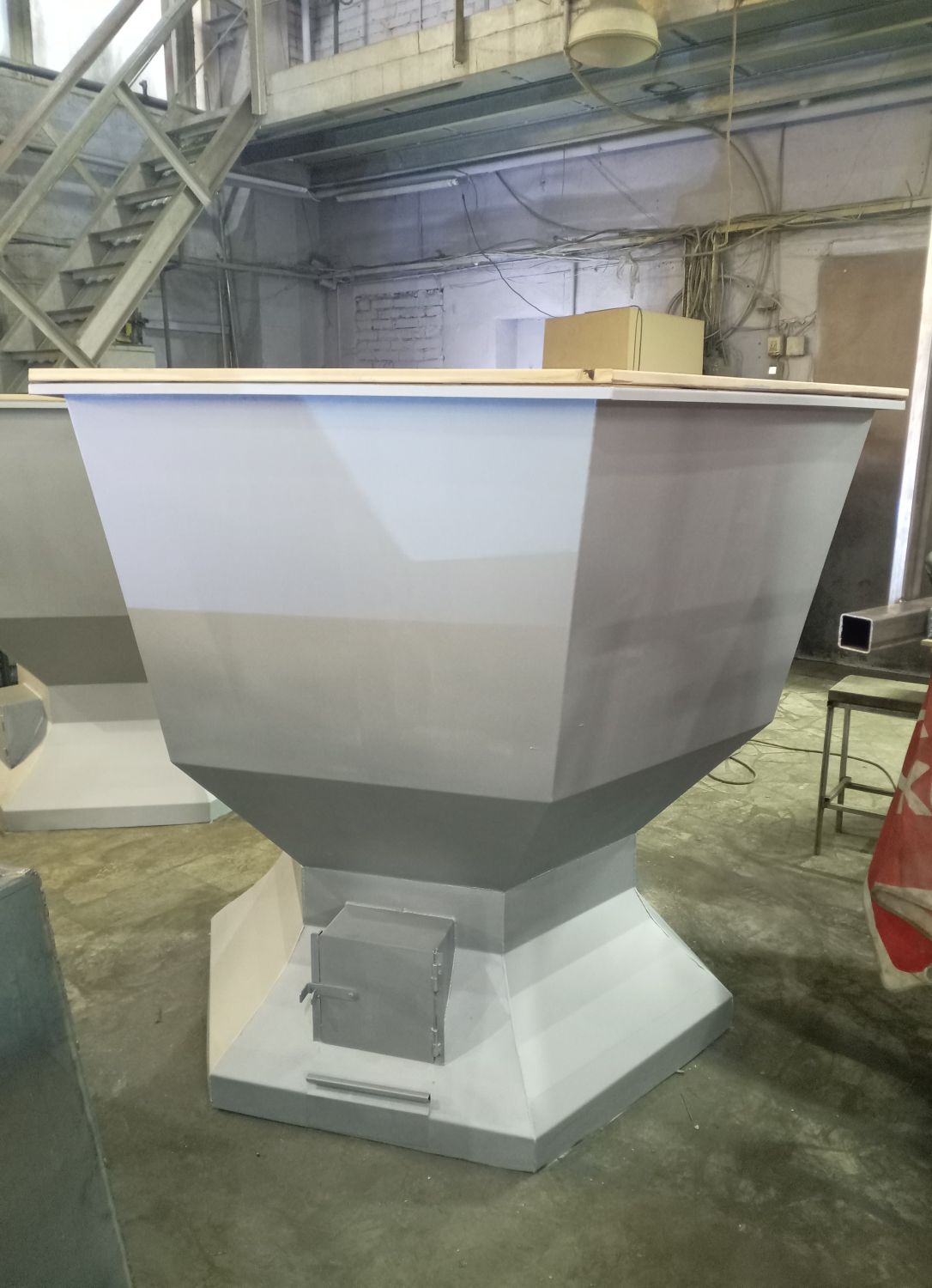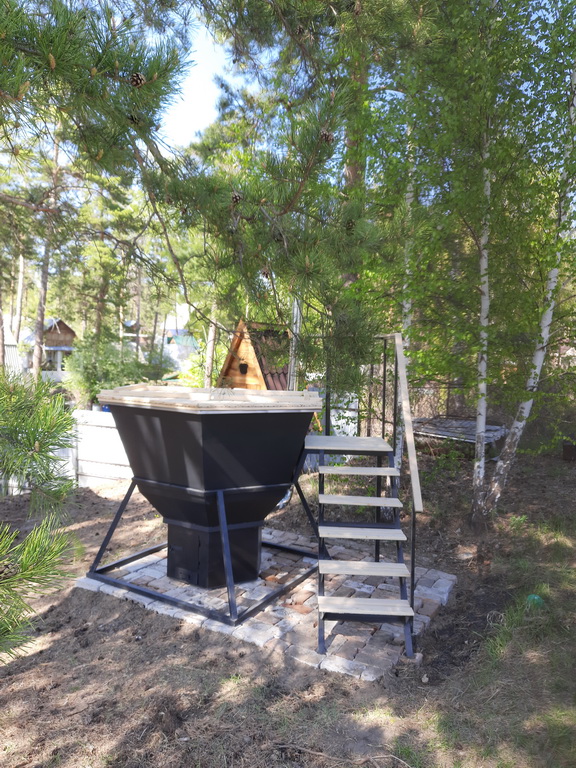 К конструкции подставки надёжно крепится лестница с поручнем. Каркас лестницы и подставка для чана выполнена из профильной трубы 40*40 мм и 20*20 мм, толщиной 2 мм.