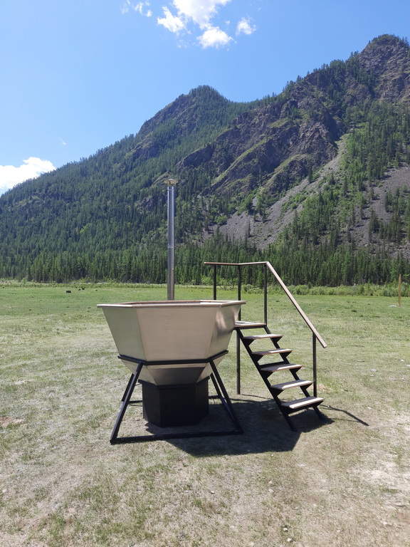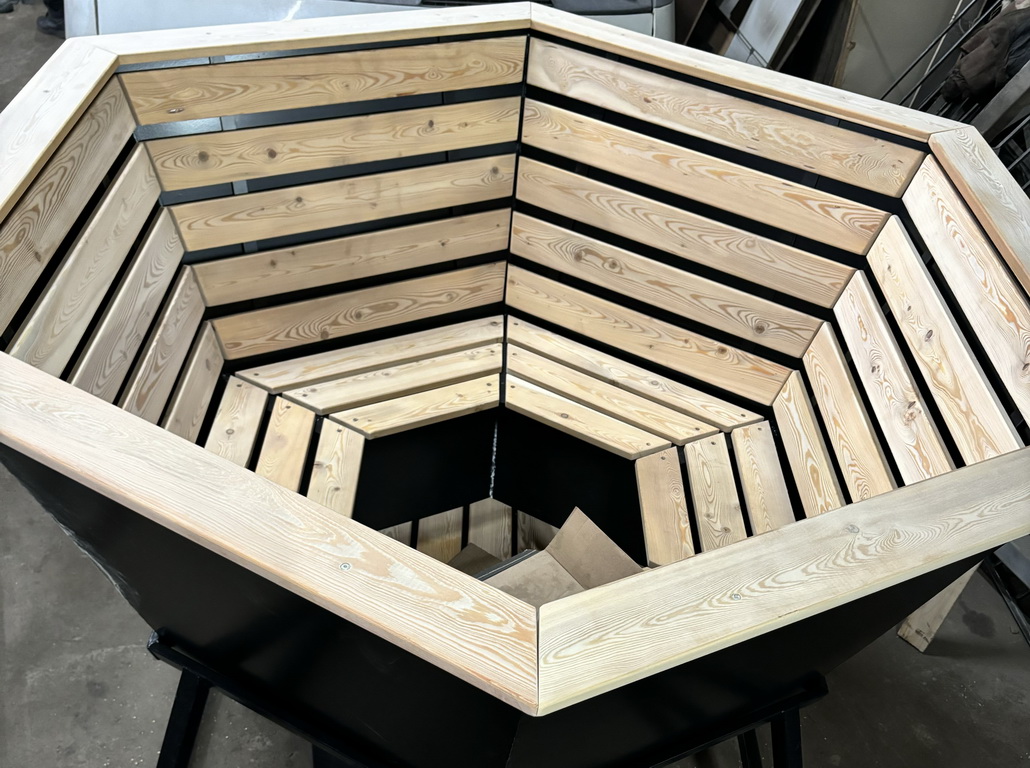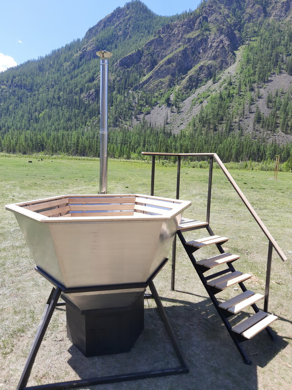 Банный чан из нержавеющей стали AISI 430 (3 мм) имеет форму шестигранной чаши с плавным сужением ко дну. Конструкция устанавливается на печное основание толщиной 3 мм. Чан ставится на печь и устанавливается в прочную подставку, которая служит ему прочным основанием, гарантируя идеальную устойчивость.